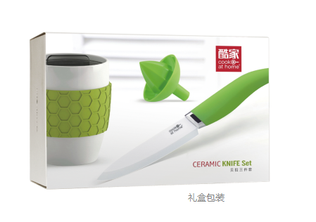 【产品尺寸】 23.2×14.9×9CM 【装箱数量】 20 pcs/ctn 【产品材料】 氧化锆+TPR+ABS手柄 【零售价格】 ¥ 130.00 【供货价格】 ¥ 32.50 产品描述: 4寸陶瓷水果刀(配刀鞘)、 榨汁器、陶瓷杯、礼盒包装。