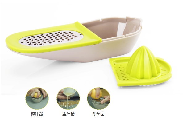 产品说明 (Description) 作为一个多功能组合设计,刨丝与榨汁相结合,配上存储容器。以船来衍生整体造型。方便、实用来体现产品的设计理念 。